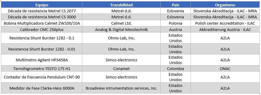 Los patrones del laboratorio de calibración de Erasmus ltda Cuentan con trazabilidad al sistema internacional de unidades mediante la calibración con laboratorio de calibración nacionales e internacionales acreditados por organizaciones organismos de acreditación tales como ONAC, ILAC, etc. Los equipos patrones con los cuales cuenta el laboratorio se pueden observar en la siguiente tabla.