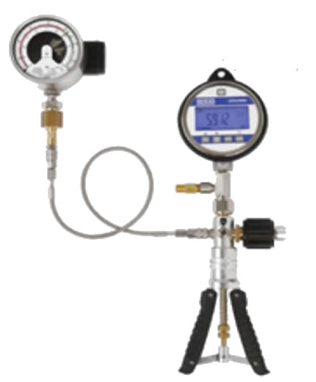 Sistema para calibrar manodensimetros de SF6 portable, incluye todos las partes necesarias para realizar la calibración con un manodensimetro digital como patrón. Se pueden probar las diferentes alarmas configuradas y reproducir la presión de trabajo.