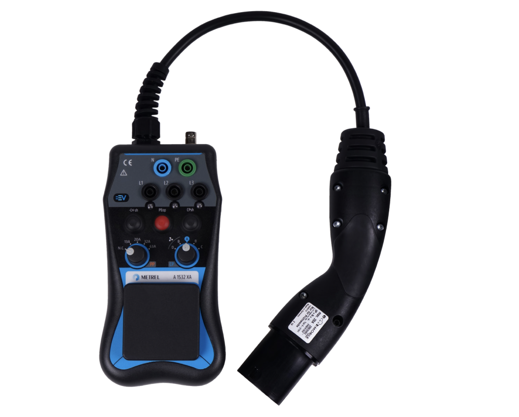 El adaptador A 1532 EVSE XA se utiliza para la verificación de la seguridad eléctrica y las pruebas funcionales de los puntos de recarga de vehículos eléctricos (EVSE) junto con los comprobadores multifunción METREL. Está diseñado para probar modos de carga 3 con conector tipo 2. La versión XA admite pruebas de carga trifásica de hasta 13A y la inyección de diferentes tipos de error, incluido PE abierto. Si se usa junto con AUTO SEQUENCE® del MI 3152 EurotestXC, la estación de carga EVSE completa se puede probar (estado por estado) eléctricay funcionalmente con solo presionar un botón. Es posible crear un informe profesional de toda la estación con MESM.