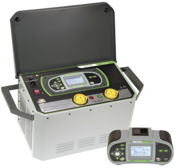 Sistema de completo para medición de tensiones de toque y paso en subestaciones, torres de transmisión y demás elementos. Consta de una fuente que inyecta hasta 50A @ 55Hz a través del sistema de puesta a tierra y un voltmetro, con un potente filtro capaz de medir únicamente la caída de tensión producida por la corriente que hace circular la fuente.