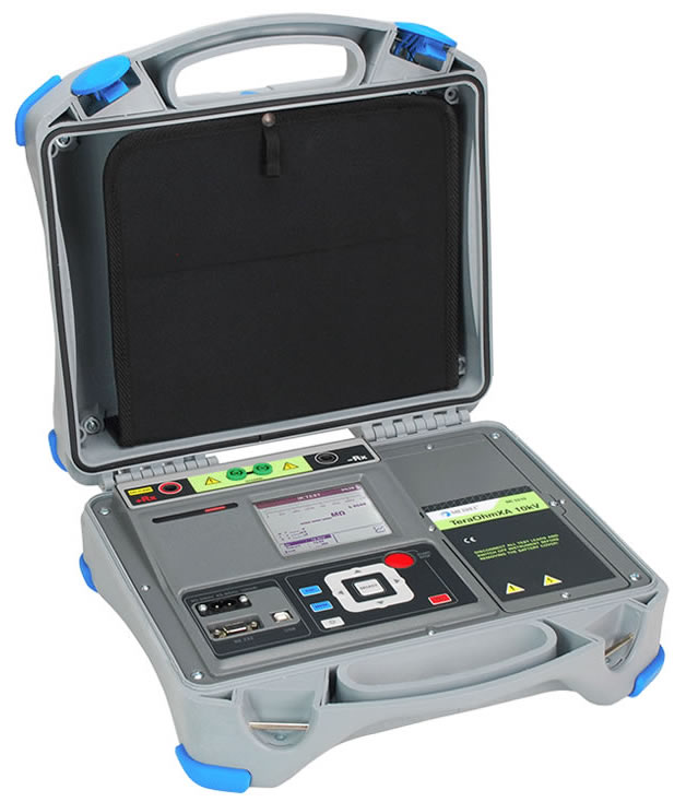 El MI 3211 TeraOhmHP 10 kV es un instrumento de prueba de alta potencia, portátil, alimentado por batería o red con una excelente protección IP (IP65), diseñado para analizar la resistencia de aislamiento mediante el uso de altos rangos de tensiones de prueba de corriente DC de hasta 10 kV. Debido a su robustez (categoría de medición CAT IV) y alta inmunidad a los campos electromagnéticos radiados, es el más adecuado para entornos industriales exigentes. La pantalla táctil o la manipulación de teclas a través de una pantalla LCD basada en menús permite una selección fácil y transparente de diferentes métodos de medición y una fácil introducción de datos. Los cables de prueba de nuevo diseño cuentan con conectores banana codificados para una conexión y bloqueo adecuados a fin de protegerlos contra la extracción no deseada o accidental.